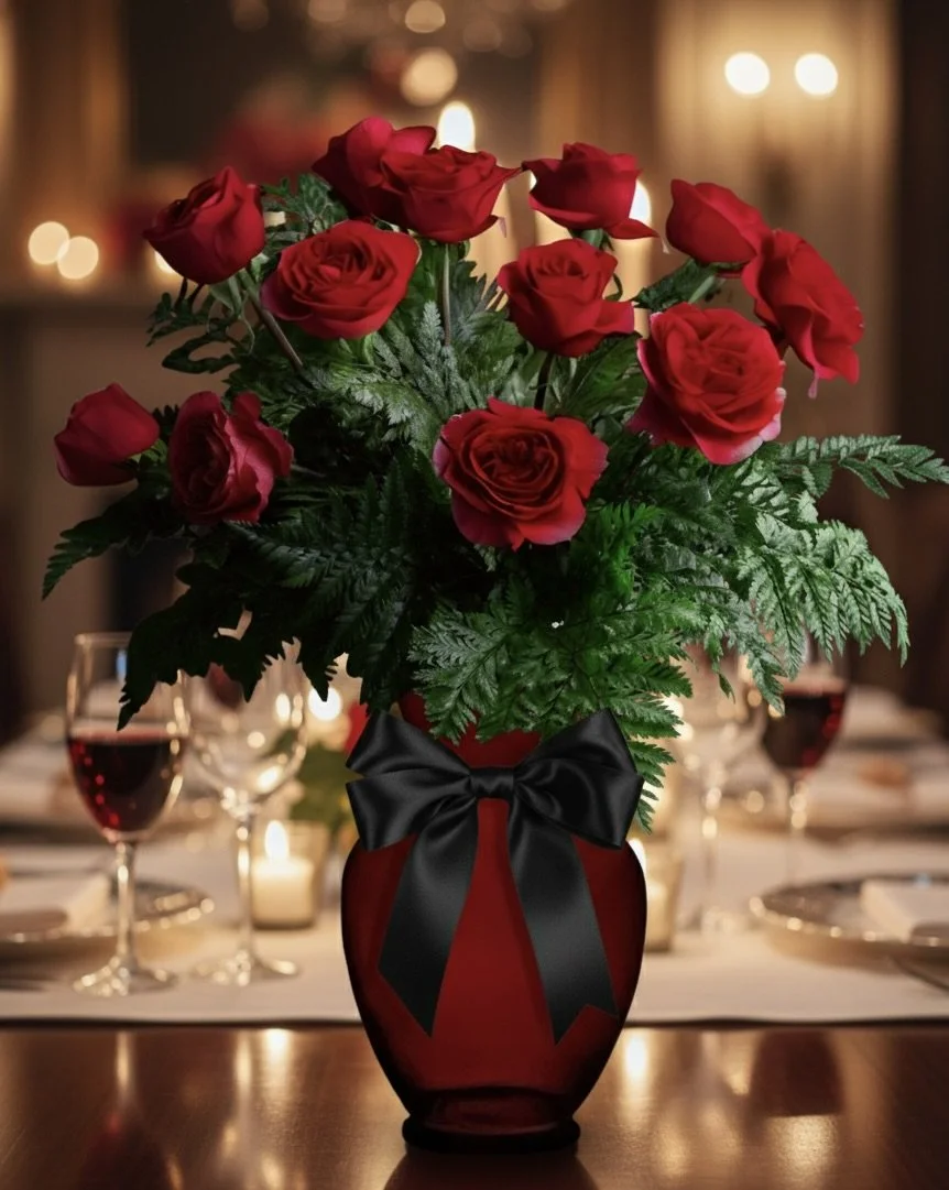 Gifts of Flowers by TA: Luxury Valentine's Day roses in Agawam, Feeding Hills & Western MA. We deliver to West Springfield, Westfield, Southwick, Longmeadow & Northern CT (Suffield, Enfield, Somers). Order our "Midnight Romance" red roses in a custom red vase with a black satin bow. Shop local today!